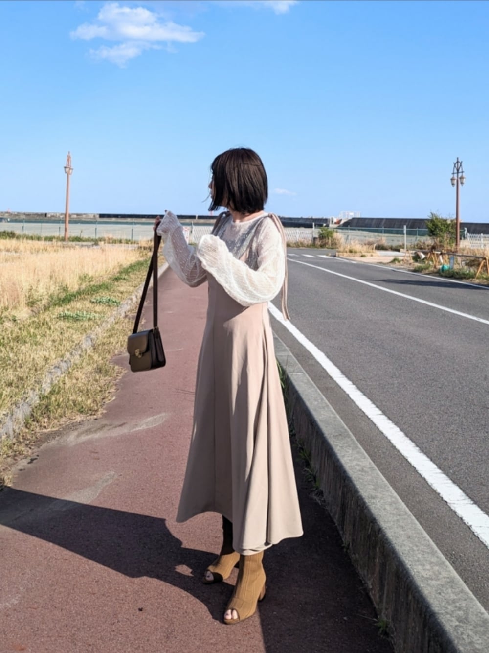 ツブツブとキャミワンピース🫧𓂃𓈒𓏸 tops #しまむら購入品 bag #lauir shoes #shein mivialoca ◇カットジョーゼットノットストラップフレアキャミワンピース フレア裾でシルエットの綺麗なワンピース︎🫶🏻 Instagram @yume___to