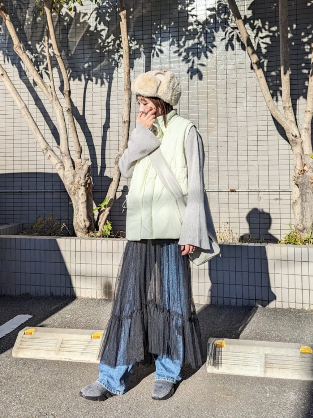 yume のダウンベスト「【 notch. by KR 】パデッドベスト」を使ったコーディネート