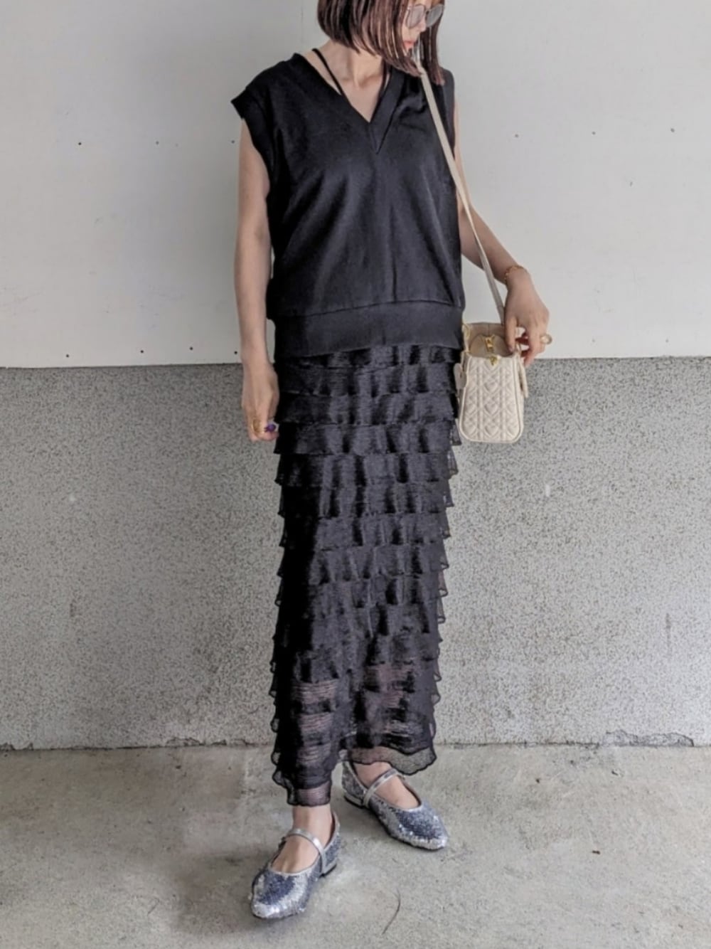 ベストとスカート ┈┈┈┈┈┈┈┈┈┈ ULEULA スウェットVネックノースリベスト color:ブラック ┈┈┈┈┈┈┈┈┈┈ しっかりした素材感のベストでロングシーズン着れる! 暑い時期は1枚で着ても可愛い♡ #PR Instagram yume___to