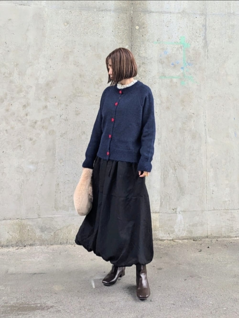 deux amourのカーディガンとバルーンスカート …˖ ネイビーに❤ボタンがかわいい deuxamour ハートボタンクルーネックニットカーデ インナーにフリル襟ブラウスを合わせて着ました。 クルーネックだから甘くなりすぎずに着られます。 deuxamour 今日はZOZOでクーポン出ています。 #PR Instagram yume___to