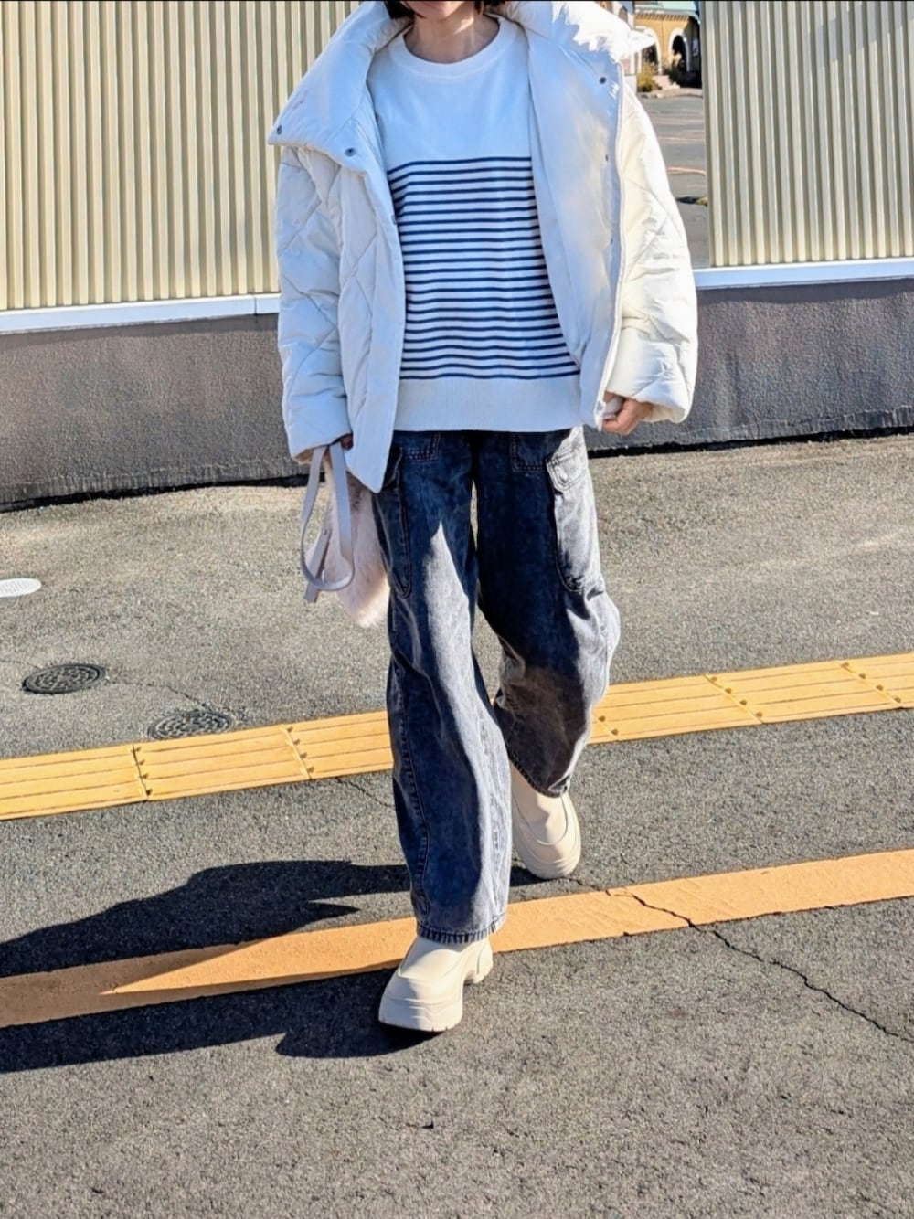 LOSUCAのボーダーニットとキルティングコートで 大人カジュアルコーデ レーヨン混でもちっとした心地良い肌触りのニット。 胸あたりからボーダーになってるのも好きなポイント☺︎ LOSUCA ✔️ボーダーニットプルオーバー ✔️2WAYワイドカラー中綿キルティングコート ZOZOでセール中です🛍 Instagram @yume___to