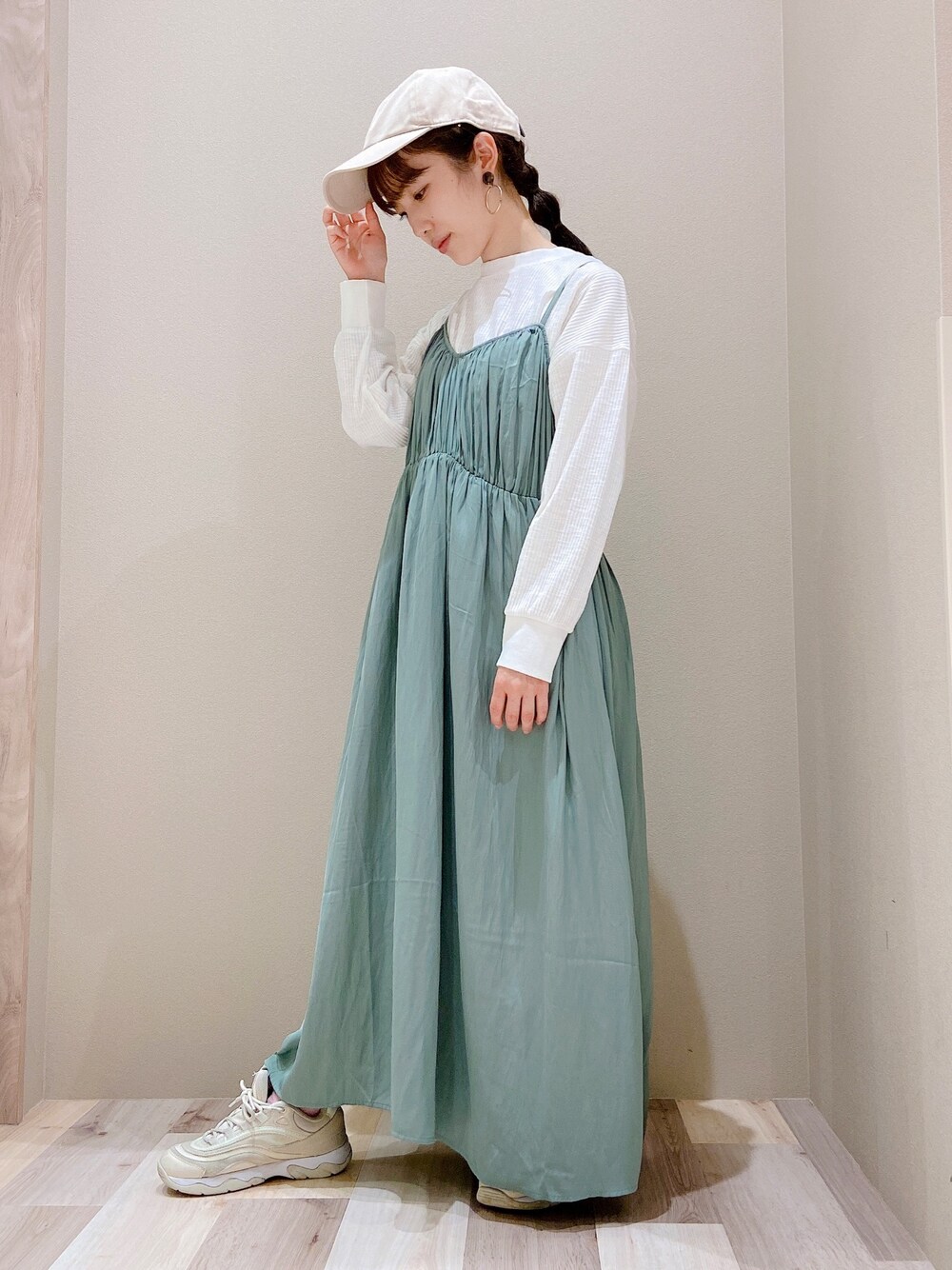 絶妙なミント色が可愛いキャミワンピ🌱 肩紐が簡単に調節できて低身長さんでも大丈夫です🙆♀️ スニーカーやキャップと合わせると可愛くなりすぎずに着られます☺️ トップスは裾がラウンドになっているので、ボトムと合わせてアウトで着ても◎