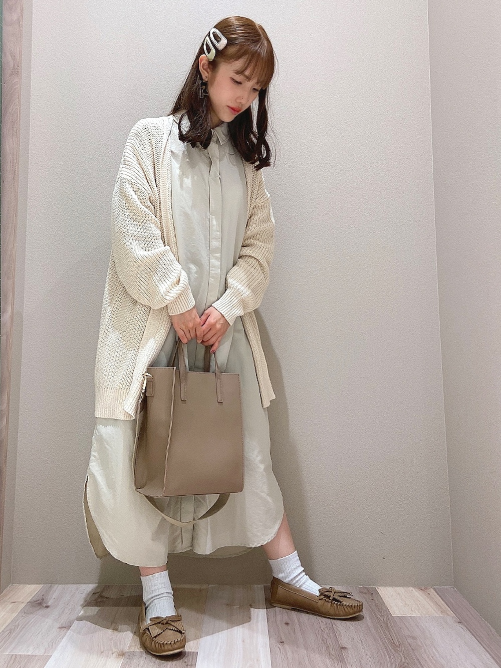 ベージュでまとめたコーデです🧸 ワンピースは薄色ですが、あまり透ける心配がない生地なのが嬉しい◎ カーディガンは洗濯機で洗える優秀アイテムです!シンプルなデザインで着回しが効きます😊 モカシンは底がふかふかになっていて脚が疲れにくく、歩きやすいです! バッグはcache cache タテ型ショルダー付きトート(¥4290)です💫しっかり自立して、トートとショルダーの2wayで使えて便利👌