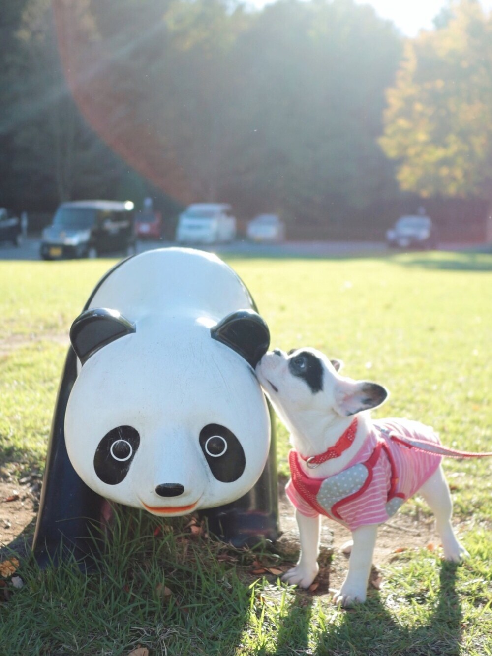 先日のフガサミットにて。 親子かな?🐼🐼 ピンクボーダーのお洋服は島忠HOMESの ペットショップで購入。プチプラコーデ!