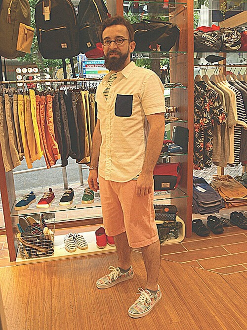 前身頃のロイヤルオックス、後ろ身頃のサッカー生地、ポケットの裏毛と異素材をミックスしたユニークなシャツが映える夏のマリンスタイル。バックも抜かりなくボーダーが存在感を出しています。元々Yシャツに頻繁に使用されるロイヤルオックスを洗い感が残った仕上げにする事で着心地も軽く、ソフトな印象に。ベーシックになり過ぎない様にポップなシューズでコーデを仕上げました!