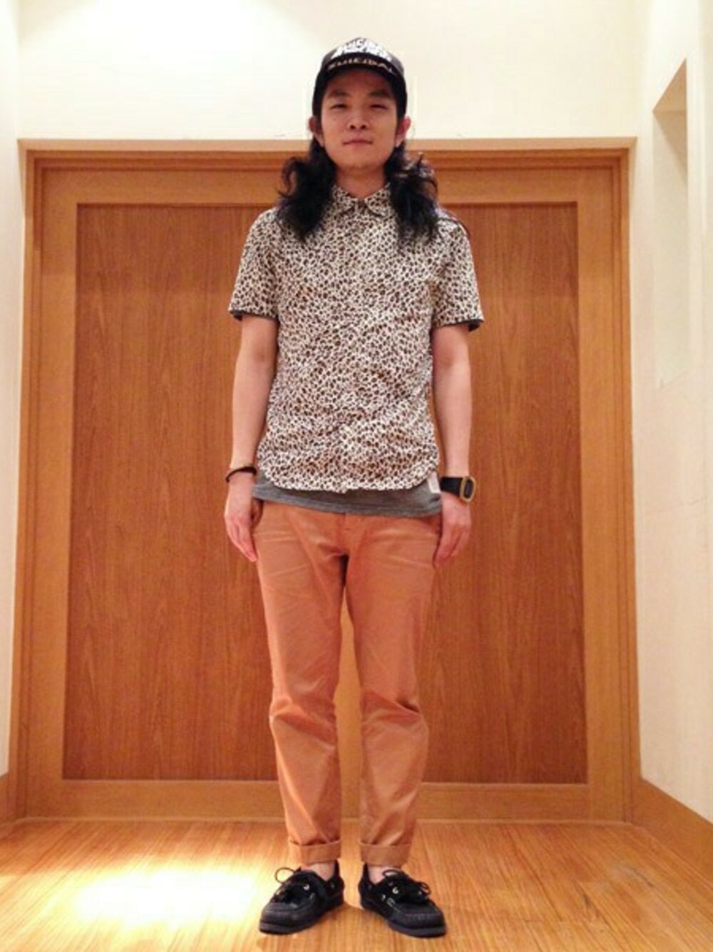 存在感のあるレオパード総柄シャツを基調に、やや着丈長めなTシャツとのレイヤードスタイル。 パンツのロールアップバランスも絶妙!!