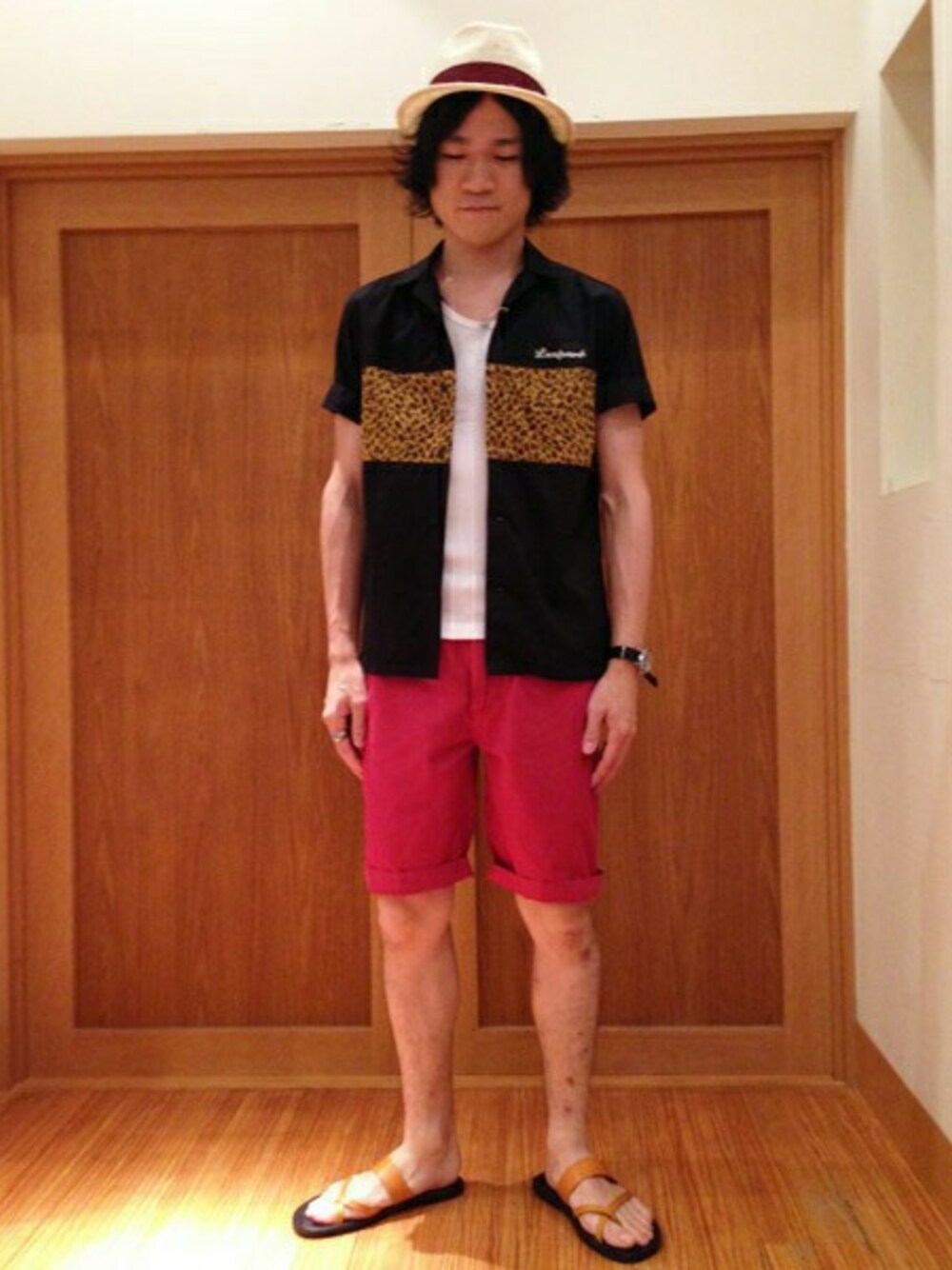 今シーズントレンドのオープンカラーシャツ+ショーツのリゾート感溢れるコーディネイトですが、 シャツの切り替えのレオパード柄がアーバンな雰囲気に!! 羽織のスタイリングにストローハットがポイントです。