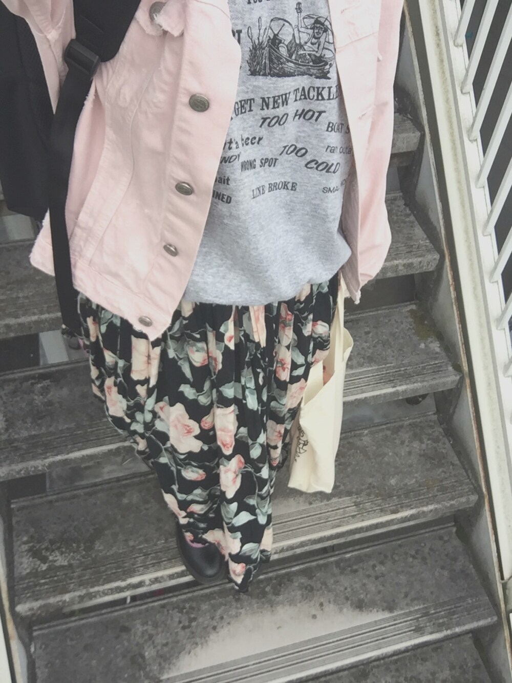 ブラック系のスカートを着用したレディースの春コーディネートの1枚目の写真