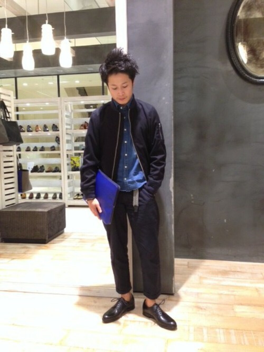 エレガントな印象のプレーントゥをMA-1と合わせて今年らしく履く。 カジュアル感を除くためにインナーにはカットソーではなくシャツをチョイス。 配色の効いたクラッチバッグなどを持ってもアクセントには尚良いでしょう。 ドレカジ兼用で使って頂ける優秀モデルです。