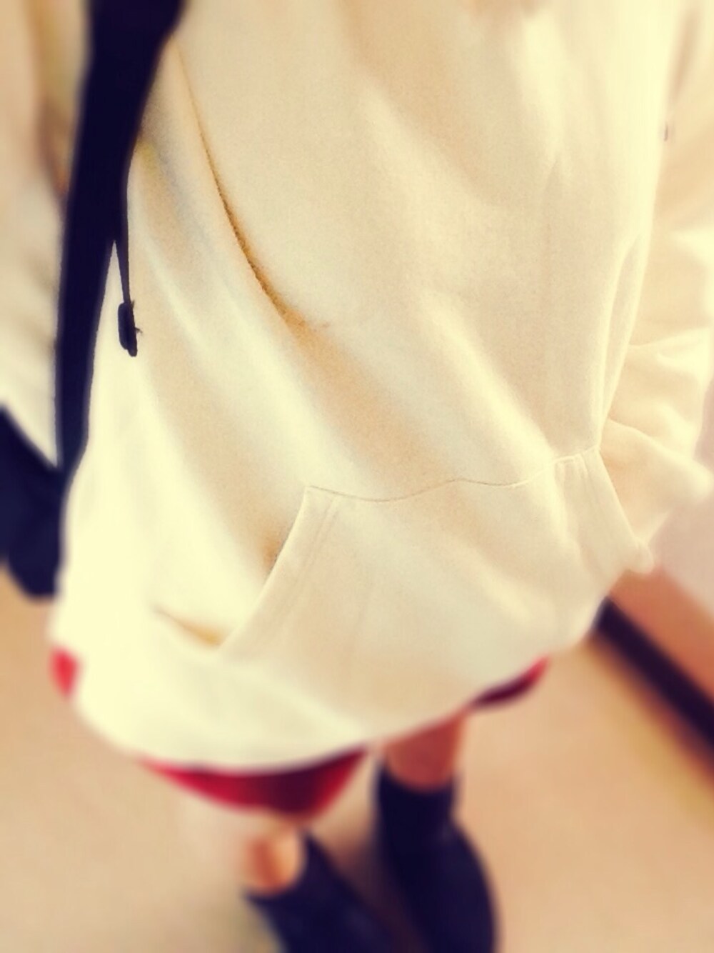 クリーム色のメンズパーカーに赤のホットパンツ。 ビッグシルエット+メンズライクです。