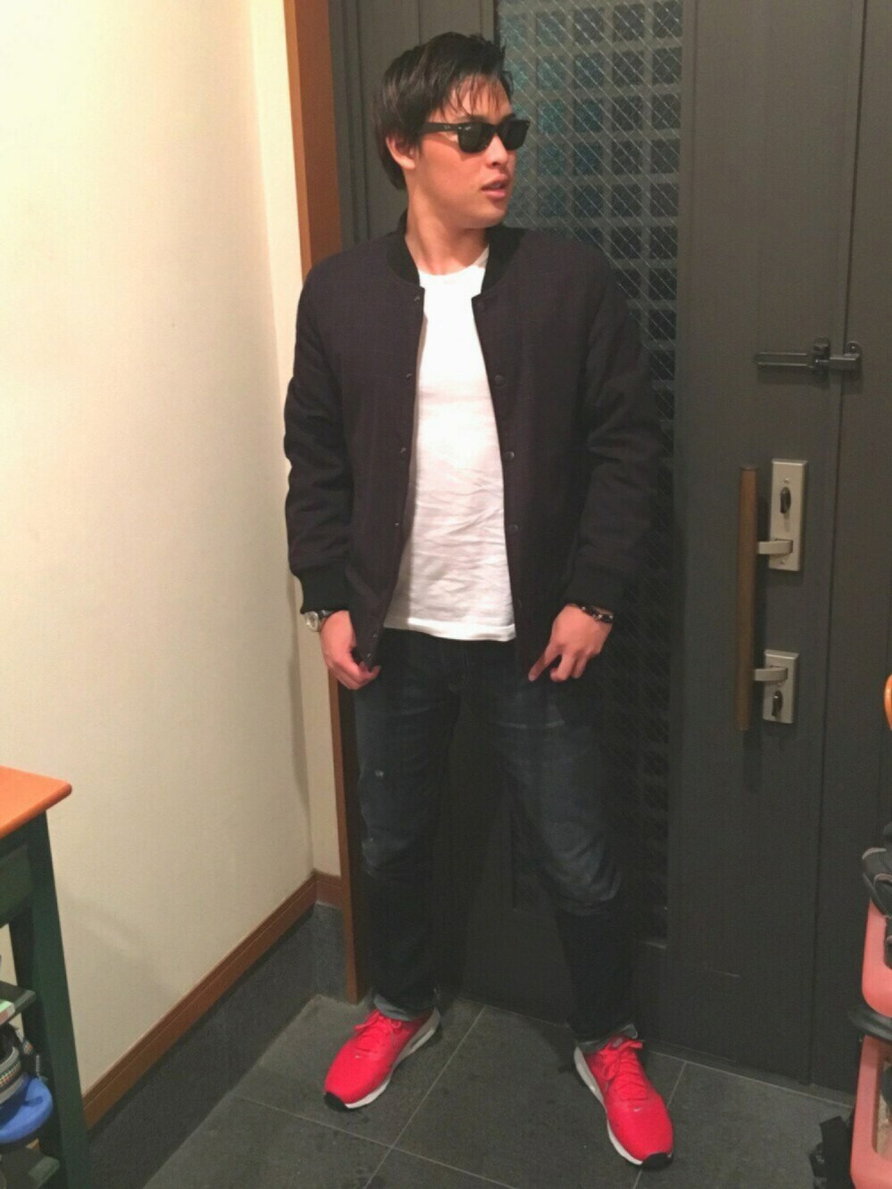 カジュアルになりすぎないようスニーカーに赤色をプラス