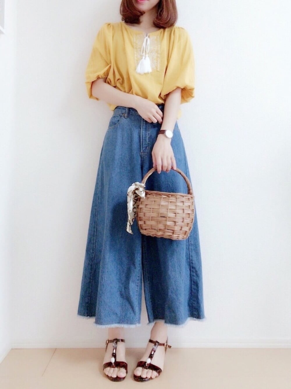 おはようございます💗 GUのブラウス、イエローで可愛いです🙈❤️ワイドパンツに合わせました✨ JELLY BEANSソンシックトーキョーのサンダル❤️センターのビーズがほんと可愛いです🙈💗 Instagram→miku.wearよろしくお願いします🙏💗 いつもご覧いただきありがとうございます❤️❤️❤️