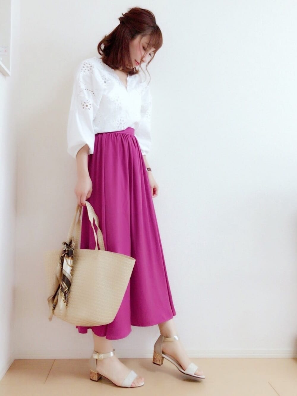 こんばんは💗 しまむらのスカラップブラウスにGUのサテンマキシスカート❤️リボン付いてるけど今日は外してます✨ JELLY BEANSのキラキラビジューのサンダルもお気に入りです💗 Instagram→miku.wearよろしくお願いします🙏💗 いつもご覧いただきありがとうございます❤️❤️❤️