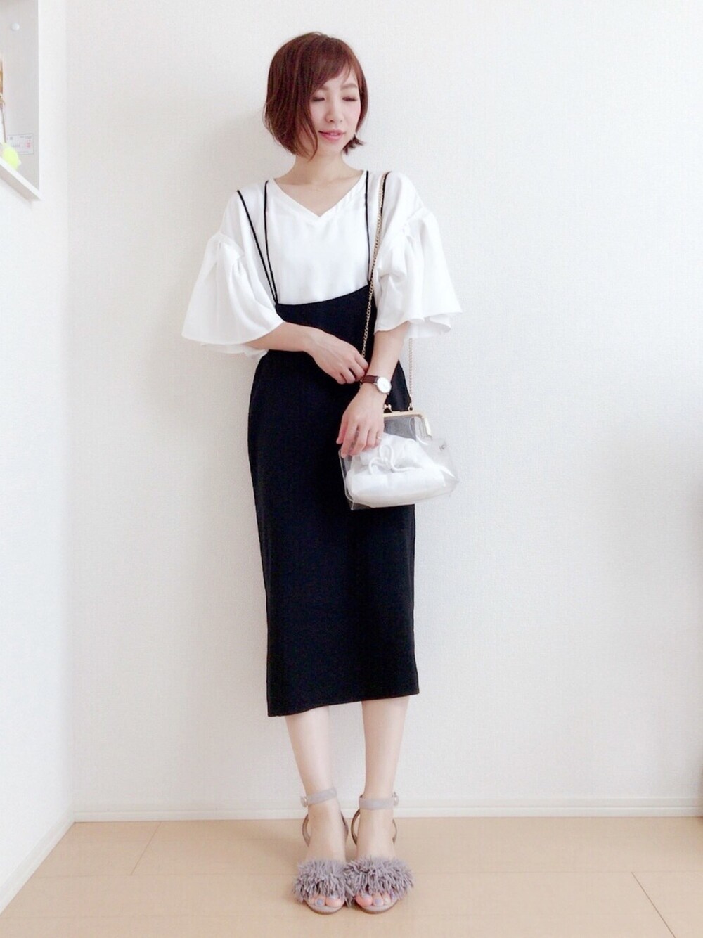 こんばんは💗 今日はKBFのトップスにスカート❤️またまた上下KBFになりました✨ JELLY BEANSのフリンジサンダルがアクセントのモノトーンコーデ💗 Instagram→miku.wearよろしくお願いします🙏💗 いつもご覧いただきありがとうございます❤️❤️❤️