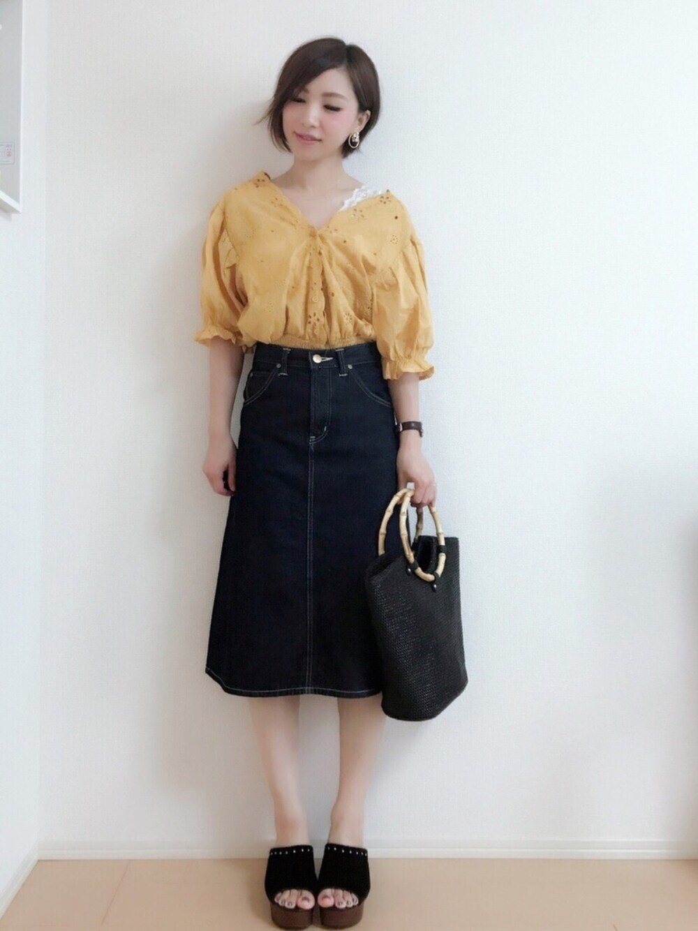 おはようございます💗 イエローのスカラップブラウス前がボタンなってて、可愛いデザイン😍😍😍 Leeのデニムスカート合わせました✨ Instagram→miku.wearよろしくお願いします🙏💗 いつもご覧いただきありがとうございます❤️❤️❤️