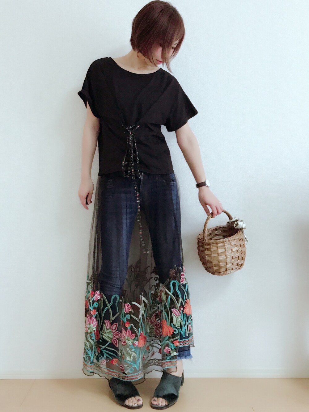 MIKUのTシャツ/カットソー「・フラワーレースアッププルオーバー」を使ったコーディネート