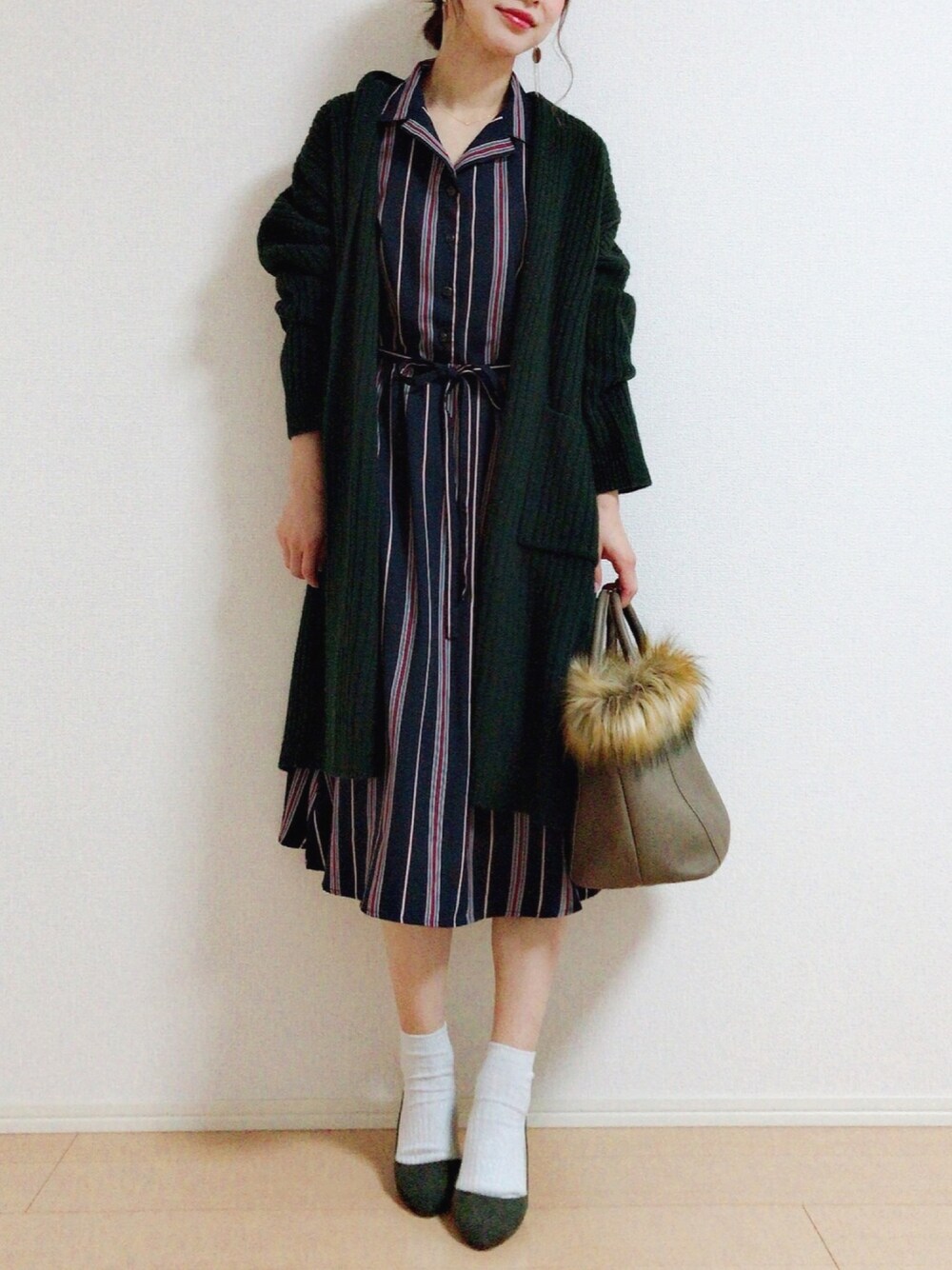 MIKUのワンピース「【WEB別注】デシンレジメンストライプワンピース」を使ったコーディネート