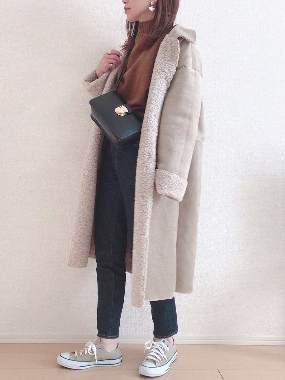 MIKUのムートンコート「クラッシュボアリバーシブルコート」を使ったコーディネート