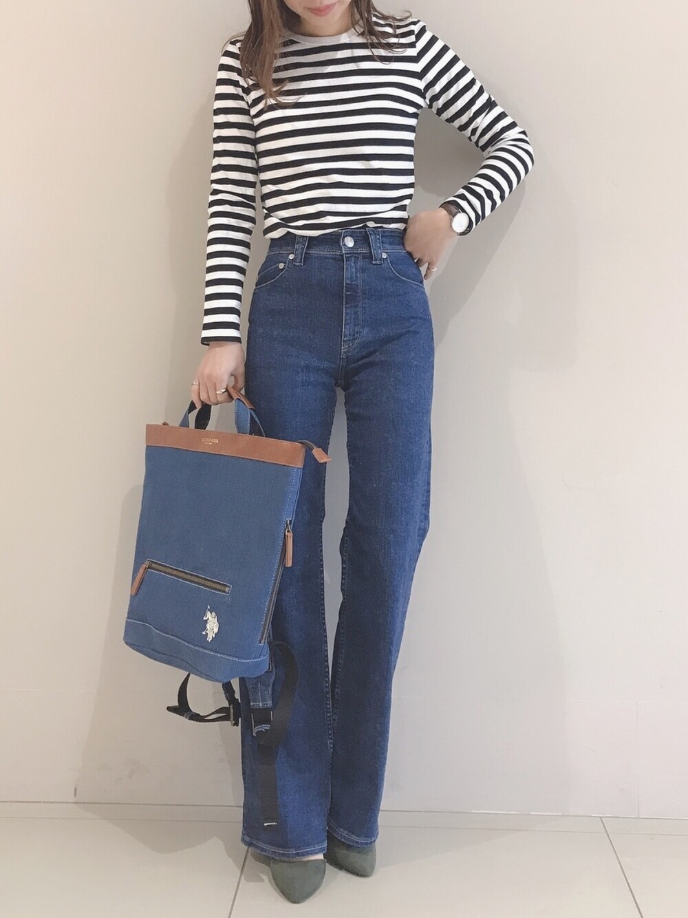 YANUKさんのハイウエストフレアデニムパンツ☺︎♡ 脚長効果♡♡♡ U.SPOLO ASSN.さんのデニム2Wayリュック シンプルで合わせやすい☺︎