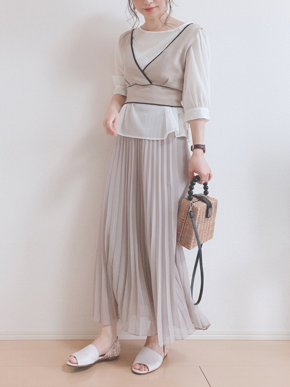 MIKUのシャツ/ブラウス「ニットビスチェ×シアーブラウスセット」を使ったコーディネート
