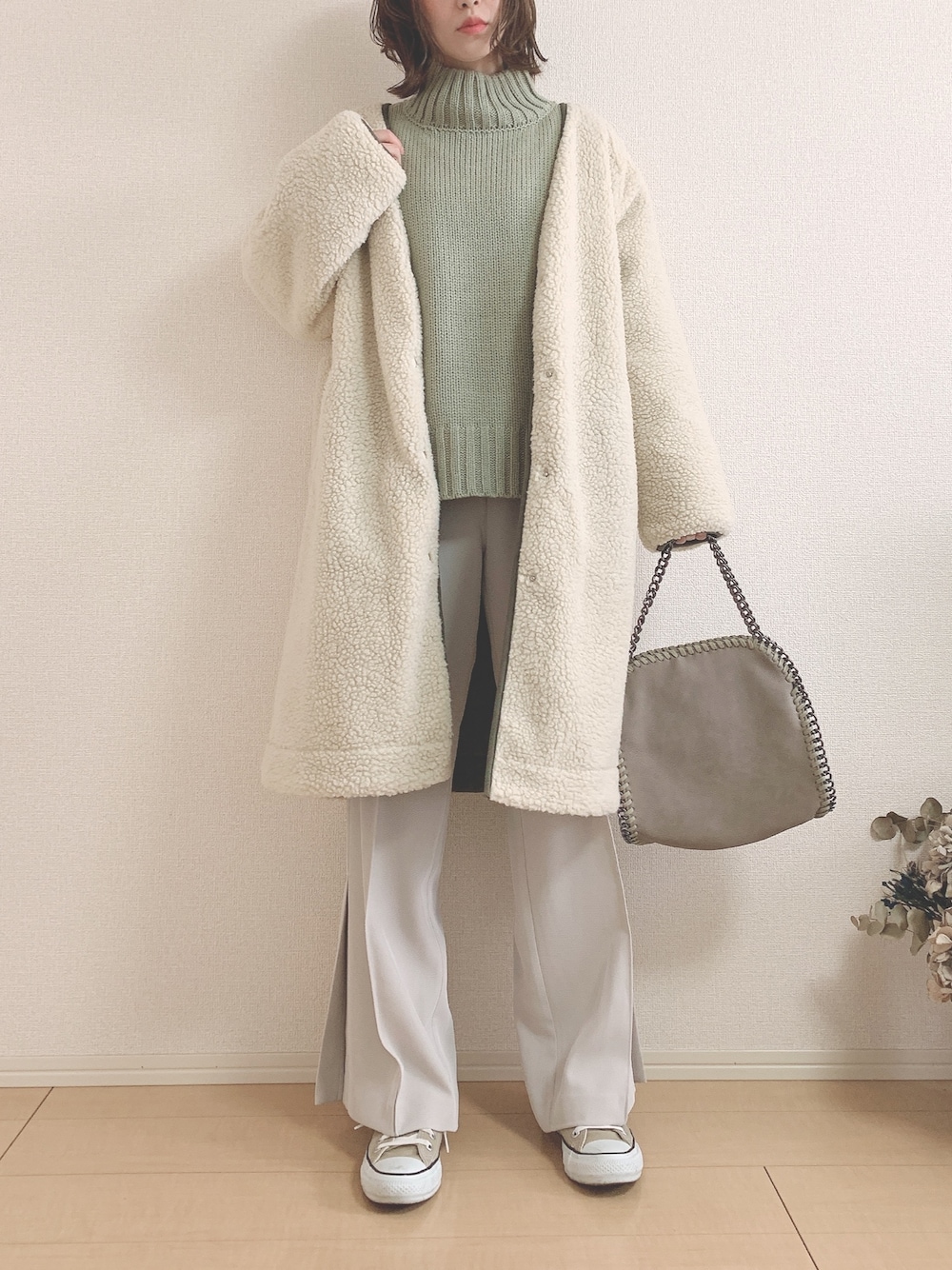 MIKUのノーカラーコート「ボアフリース×キルティング リバーシブル2WAYノーカラーパイピングロングコート」を使ったコーディネート