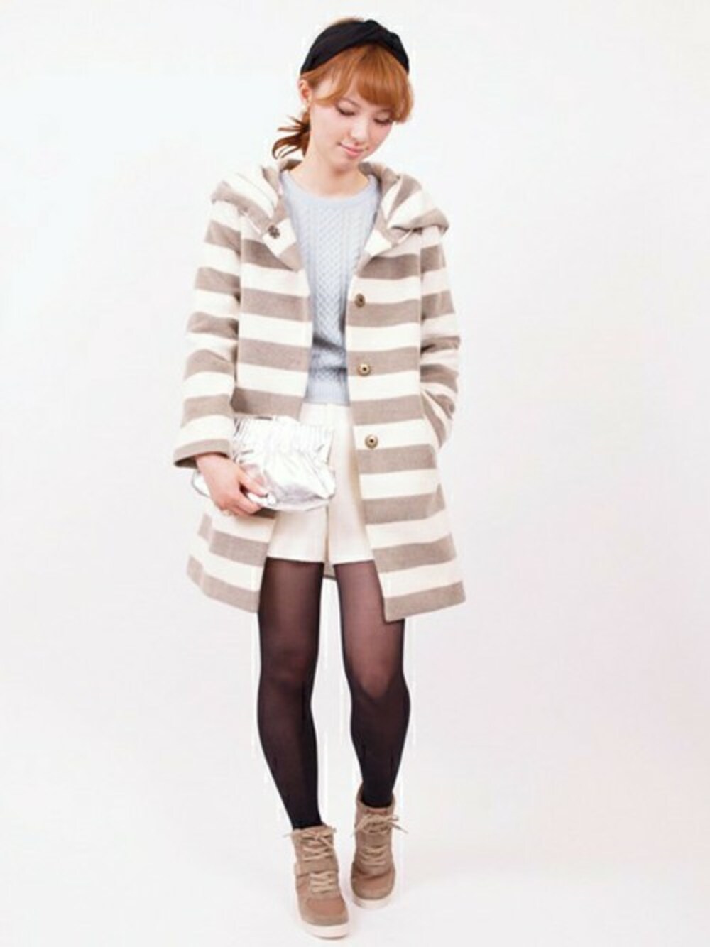 トレンドのケーブル編みニットは柔らかいアイスブルーをコーディネートのアクセントに。グレーとオフホワイトのボーダーが新鮮なビッグフードのコートでカジュアルに合わせました。女の子らしい色使いでカジュアルでも可愛らしさを演出します。