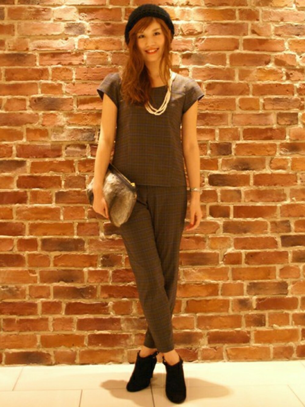 チェックプリントが可愛いトレンドのセットアップスタイル!バラバラでもスタイリングの主役になる優秀アイテムです。小物はブラックでまとめて甘くなり過ぎないコーディネートに。