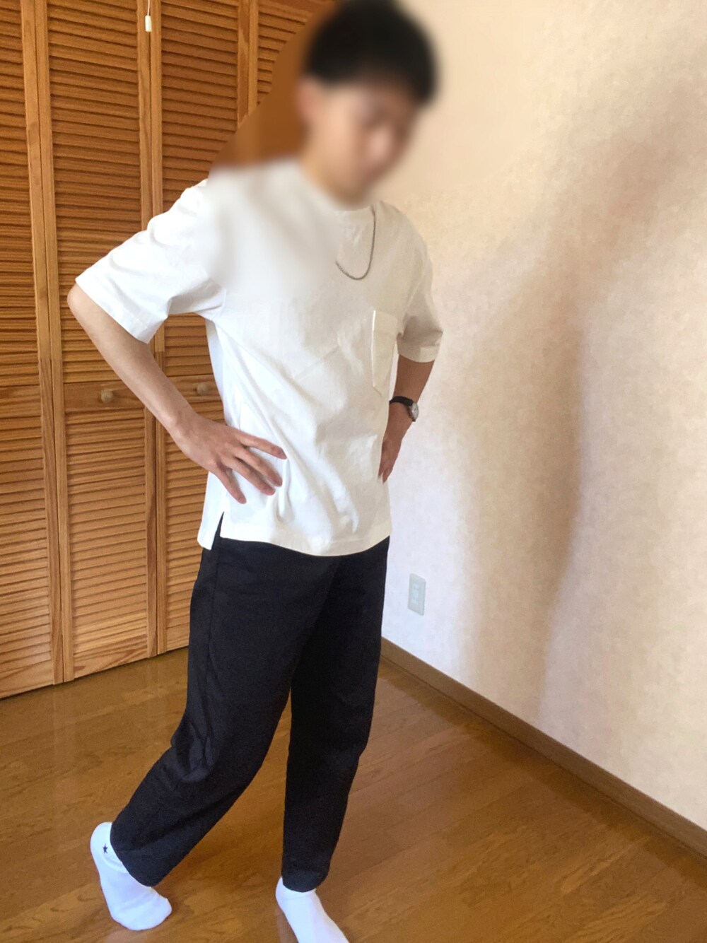 夏のシンプルコーデ! 白のユニクロUのTシャツと GUの黒のシェフパンツでシンプルに合わせる プラスネックレスと黒の腕時計でアクセント を加えました。