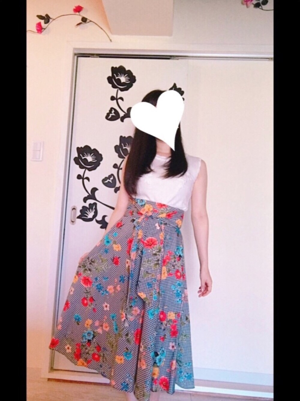 休日。 主役はスカート。柄が可愛すぎて。 上はシンプルに白のトップス。見えないけど、お花の刺繍が入っています。 髪はストレートに。
