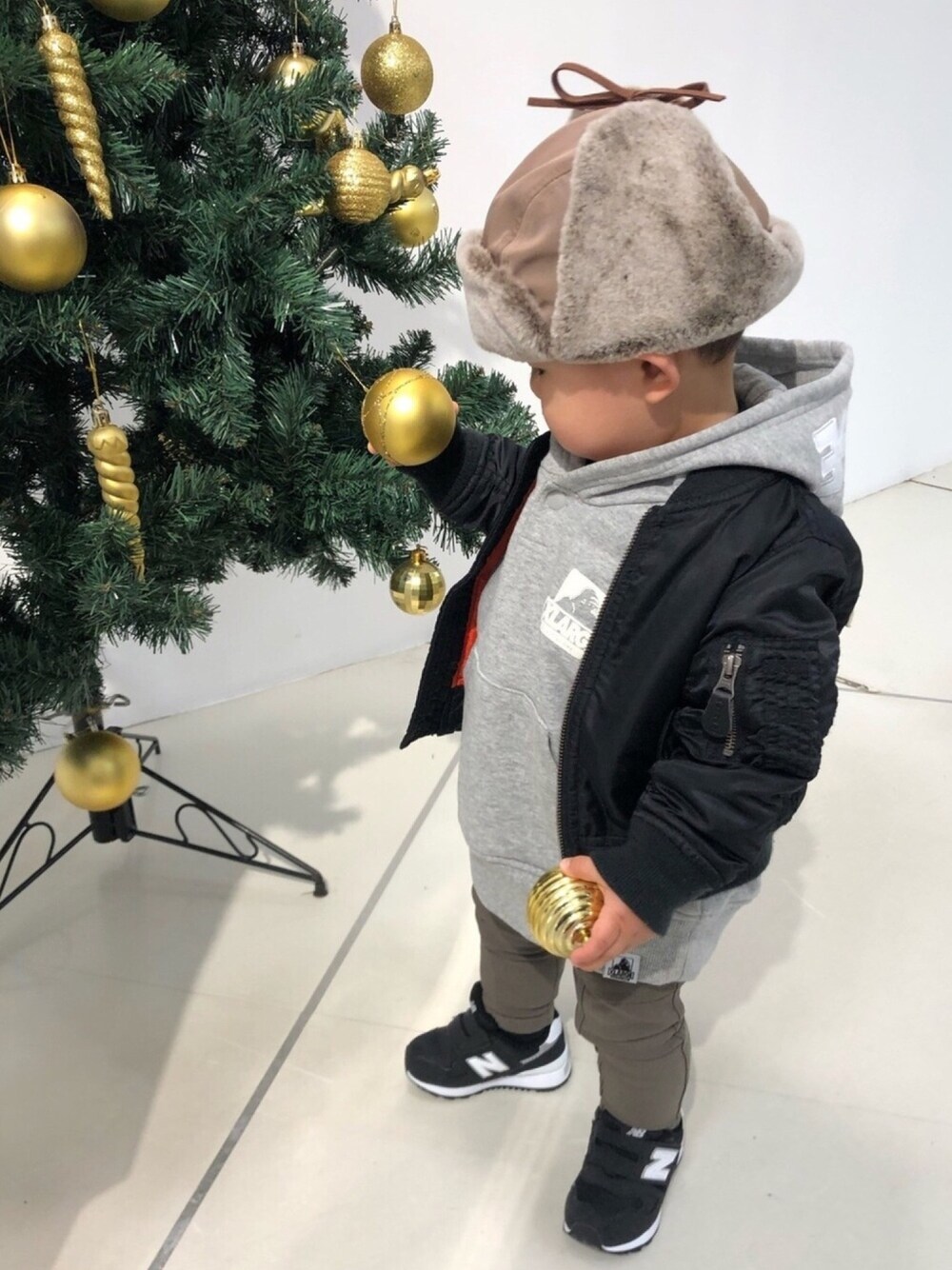 ご覧頂きありがとうございます🙇♀️ お買い物コーデ🖤 後ろがロゴ×ロゴになってしまいましたが…🤦♀️ 結局BREEZEのパンツは色違いで購入。笑 黒も買おうとしたら流石に違う種類のパンツにしなさいと止められました🤭 お店のツリーの飾りを取って逃走する小僧。目が離せません。