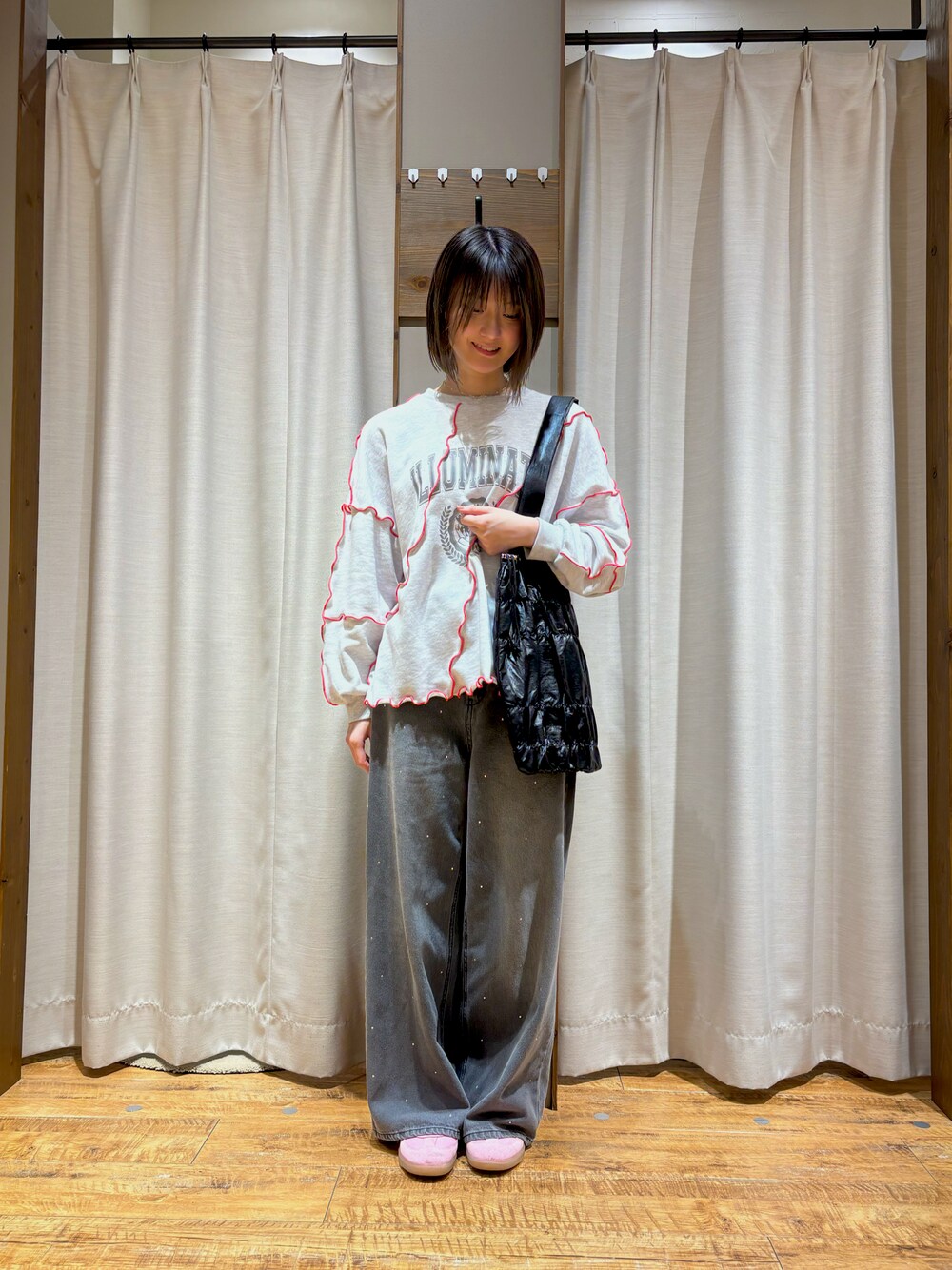 スウェット✖︎デニムのゆるコーデです🩷 スウェットは秋にちょうどいい厚さです♪ デニムは細かいキラキラのストーンが付いていています😚