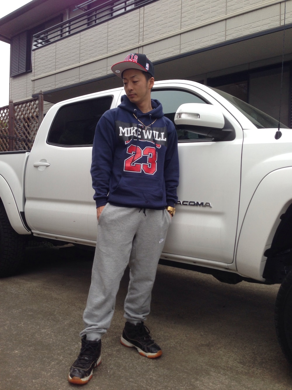 トップス:MIKE WILL MADE IT パンツ:NIKE 時計:NIXON 靴:JORDAN11オリジナル キャップ:Mitchell&Ness スウェットスタイル〜