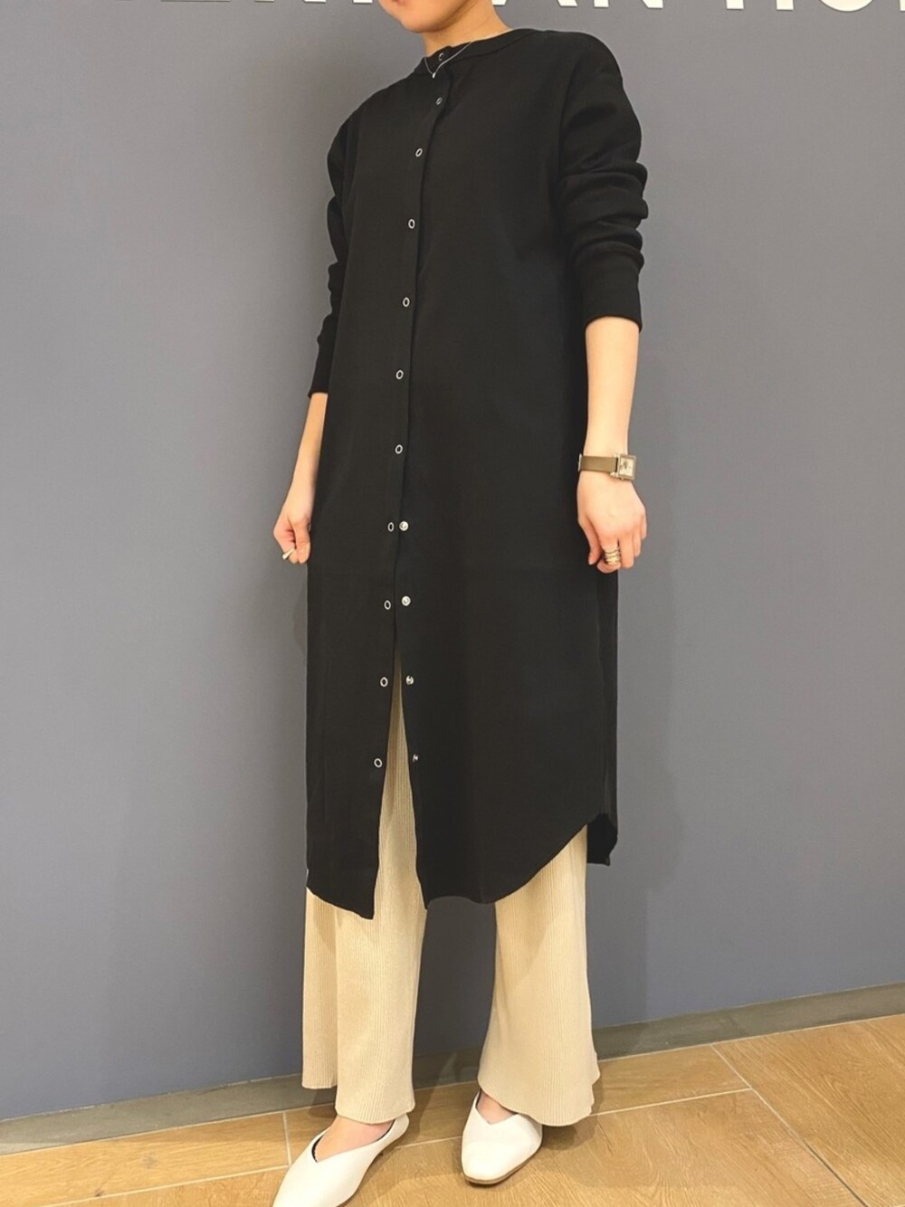 カーディガンとリブパンツを合わせました♪ カーディガンは前を全部締めると ワンピースとしても使えます🙆♀️ 新作のパンプスはとっても履きやすい! 普段のサイズよりワンサイズ小さめを お勧めしております⭐️