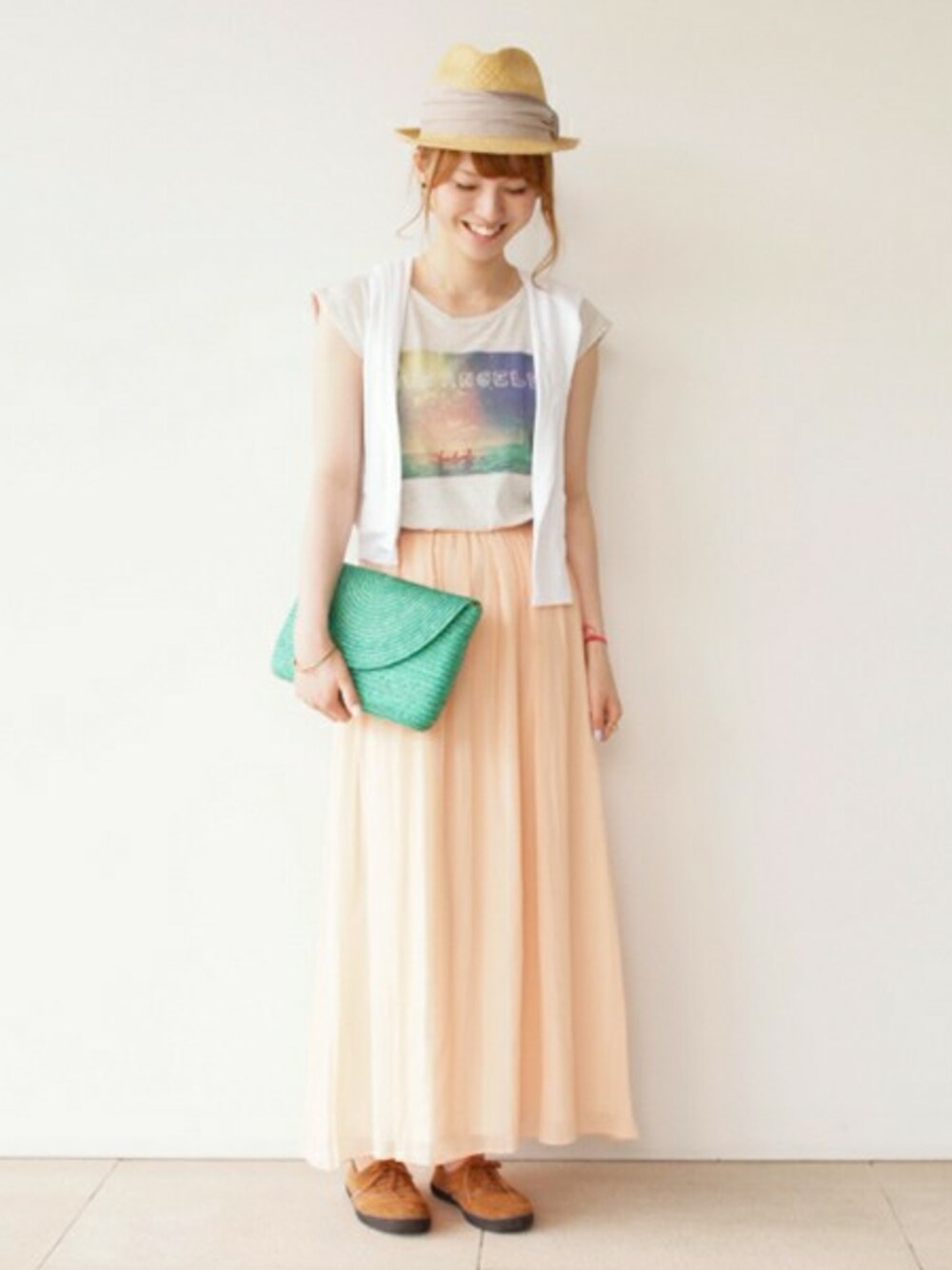 夏らしいプリントTシャツをメインにスタイリングしました。今の時期に便利な薄手素材のパーカーを肩掛けにしてアクセントに。ふんわりマキシスカートで女の子らしいカジュアルスタイルにまとめました。