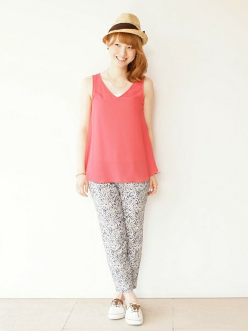 シンプルなノースリーブブラウスは前がさらりとした生地、後身頃がカットソー生地になっているので、表情が出る一枚。きれいな発色がポイントです。秋まで使えるカジュアルにもキレイめにも合わせやすいペイズリーパンツとコーディネートしました。