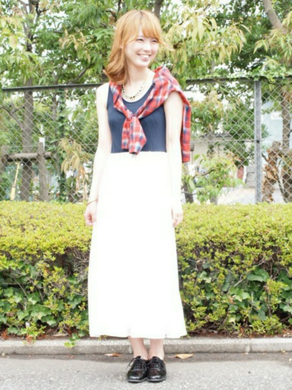 カットソー素材をトップスにした気軽に使えるマキシワンピースに、肩掛けで秋色のチェックシャツを少し取り入れたスタイリングにしました。一枚でぐっと季節感が変わるのでおすすめです。