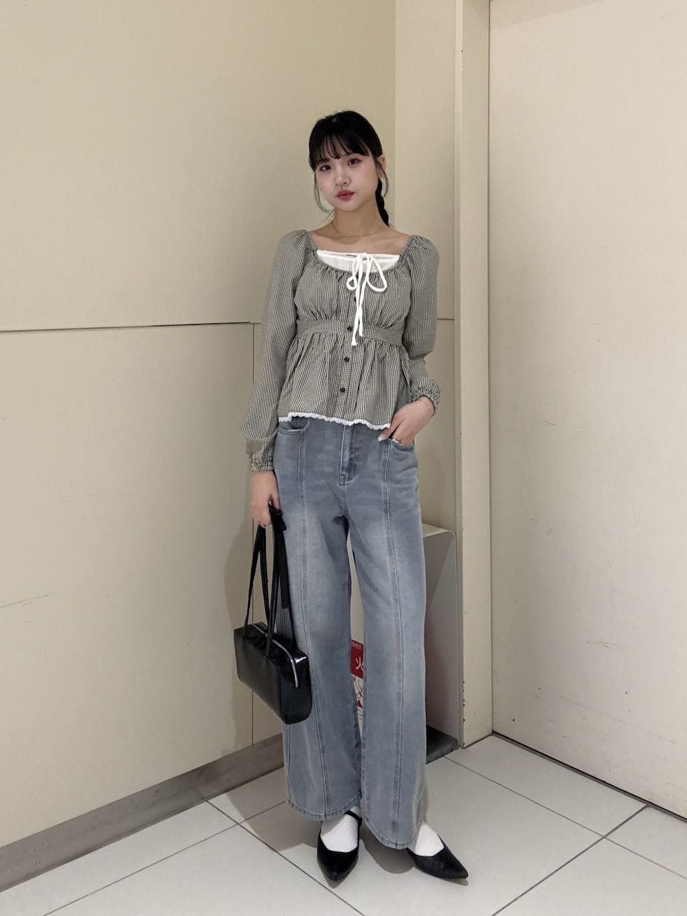 ************************* 身長:165cm /普段サイズ:S.M👟24cm 骨格:ウェーブ/パーソナルカラー:ブルベ冬 Instagram▷▷@miku__722 WEAR▷▷@105439 ************************* ・ブラウス《ブラック.FR》 ギンガムチェック×リボンでガーリーさ満点🫶🏻 デニムと合わせてカジュアルに着るのがおすすめです☺︎ ・デニム《ブルー.M》 センターラインが入っているので脚長効果抜群!
