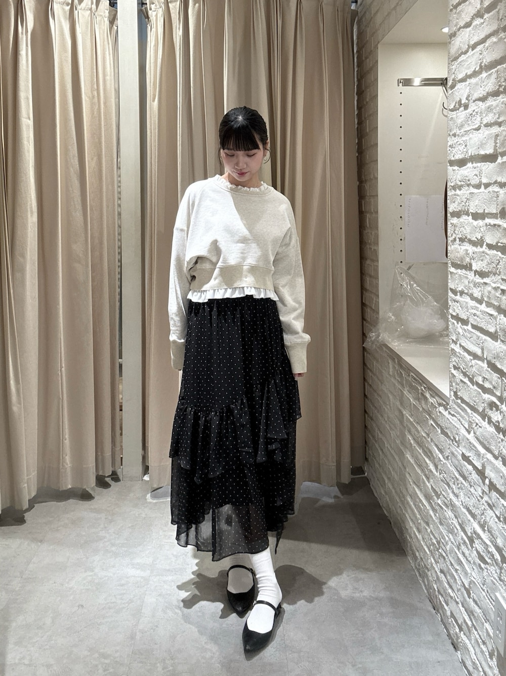 ************************* 身長:165cm /普段サイズ:S.M👟24cm 骨格:ウェーブ/パーソナルカラー:ブルベ冬 Instagram▷▷@miku__722 WEAR▷▷@105439 ************************* ・トップス《アイボリー.FR》 袖と衿のフリルは取り外し可能です☺︎ ガーリーからシンプルなコーデまで幅広く使える万能スウェットです🫶🏻 ・スカート《ブラック.M》 トレンドのドットアイテムは一つ持っておくと◎トップスを選ばす合わせやすいスカートです🌟