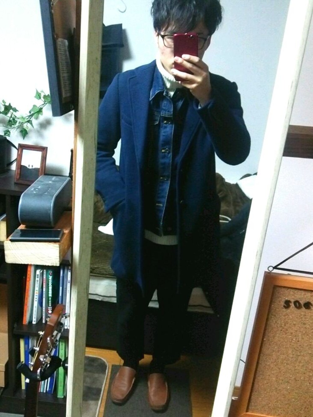最近の流行り? アウトインデニムです! はじめてのコーデだったんでシンプルに♪ でも、ワンポイントほしかったんで靴は色のトーンを少し上げました 靴下もトーンを殺さないよう黒でズボンと統一しました テスト期間の息抜きに(^^)