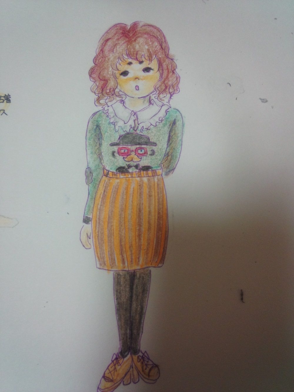 白ブラウス、おじさんニット、ストライプスカートにイン。灰色リブタイツに、明るい茶色のブーティー。