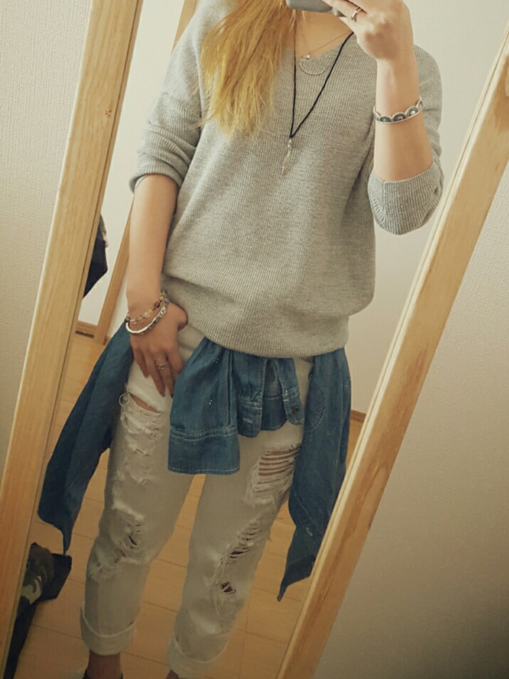 シンプルコーデ♪ ドルマンニットとダメージボーイズデニムで ゆるーいカジュアルです( ´∀`) せっかくお天気良いのに… 仕事、頑張ろ。(笑)