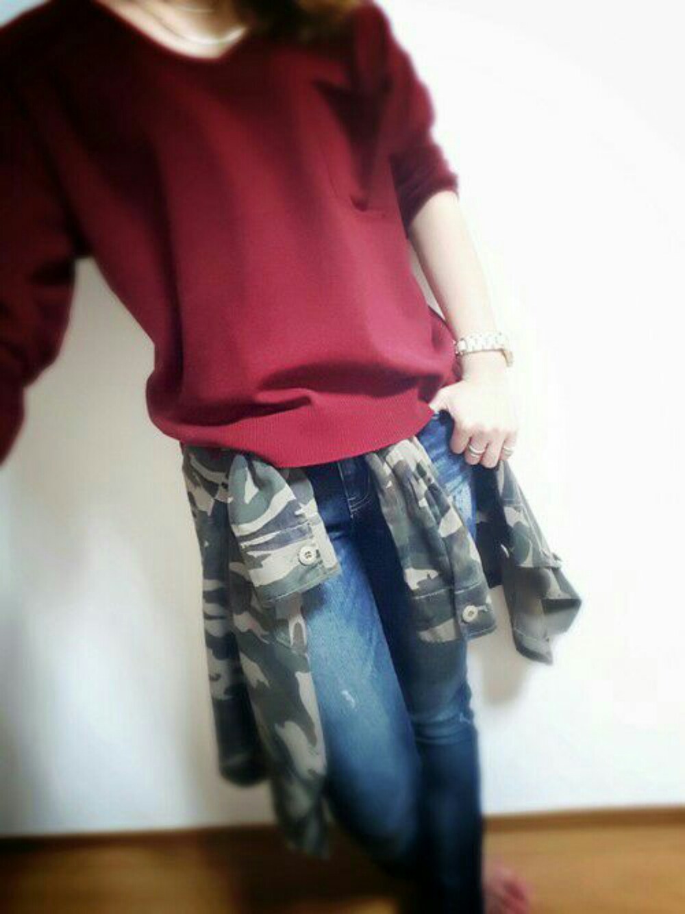 かなり久々の投稿(>_<) もうすっかり売ってるものは秋モードですねwww まだまだ暑いのに(;・∀・) とか言いつつ、秋先取りしてみました(笑) ボルドートップス×デニムパンツ! 好きな組み合わせです♪ 髪色明るいから、 ボルドー着ても老けない(  ̄- ̄)b