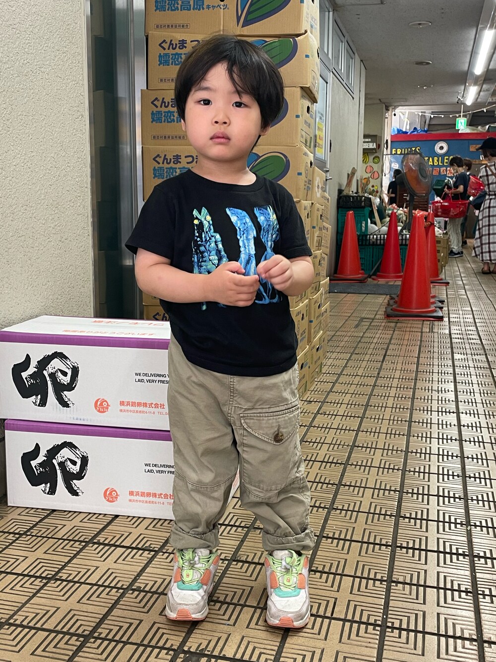 ブラック系のTシャツ/カットソー、グリーン系のカーゴパンツ、ホワイト系のスニーカーを着用したメンズの夏コーディネートの1枚目の写真
