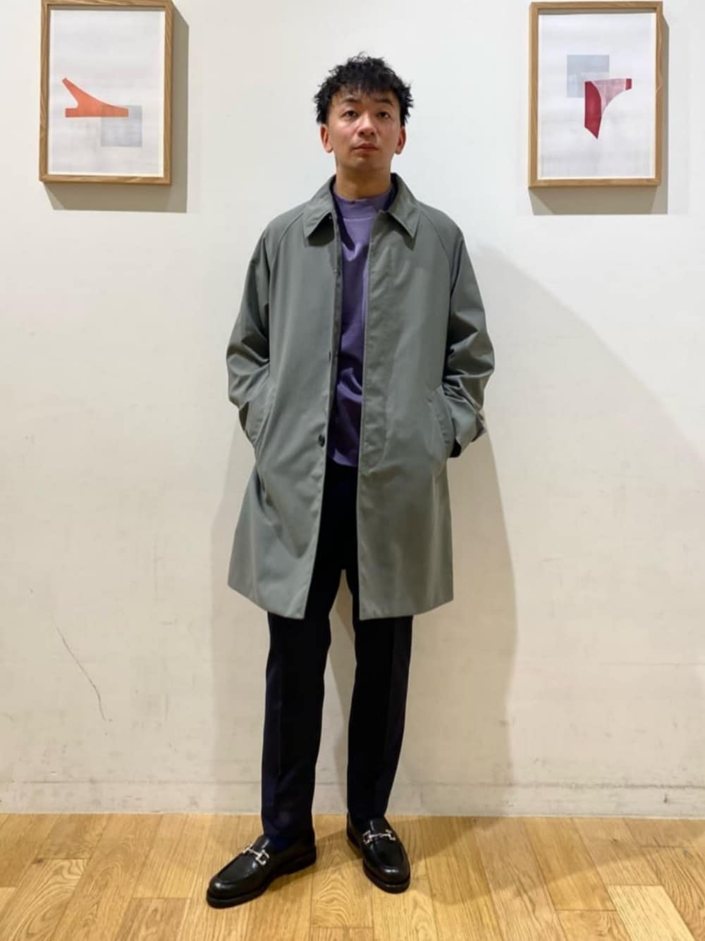 【サイズ感】 アウター:ゆったり ジャケット:標準的 カットソー:標準的 ボトムス:やや細身 【コーディネートポイント】 ナイロンステンカラーコートにハニカムジャージジャケットをコーディネートしました。 足元にビットローファーを合わせ、上品にまとめました。