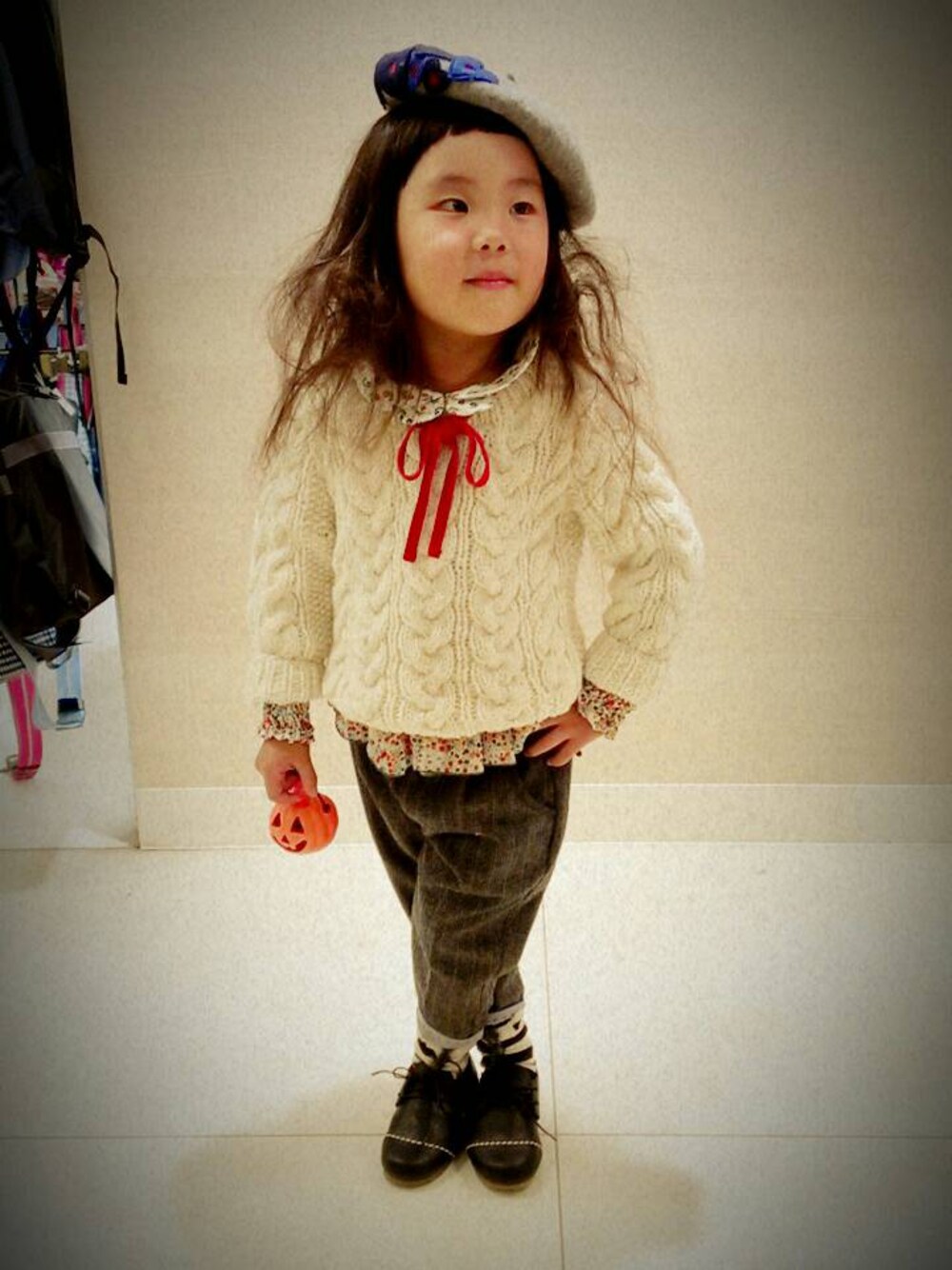 ハロウィンに向けてのお出かけコーデ。 女の子らしくお花やハートがいっぱい! モデルちゃんもご機嫌です☆ ※着用セーター カラー:オフホワイト サイズ:S モデル:うーちゃん(4歳) スタッフ・さわさと