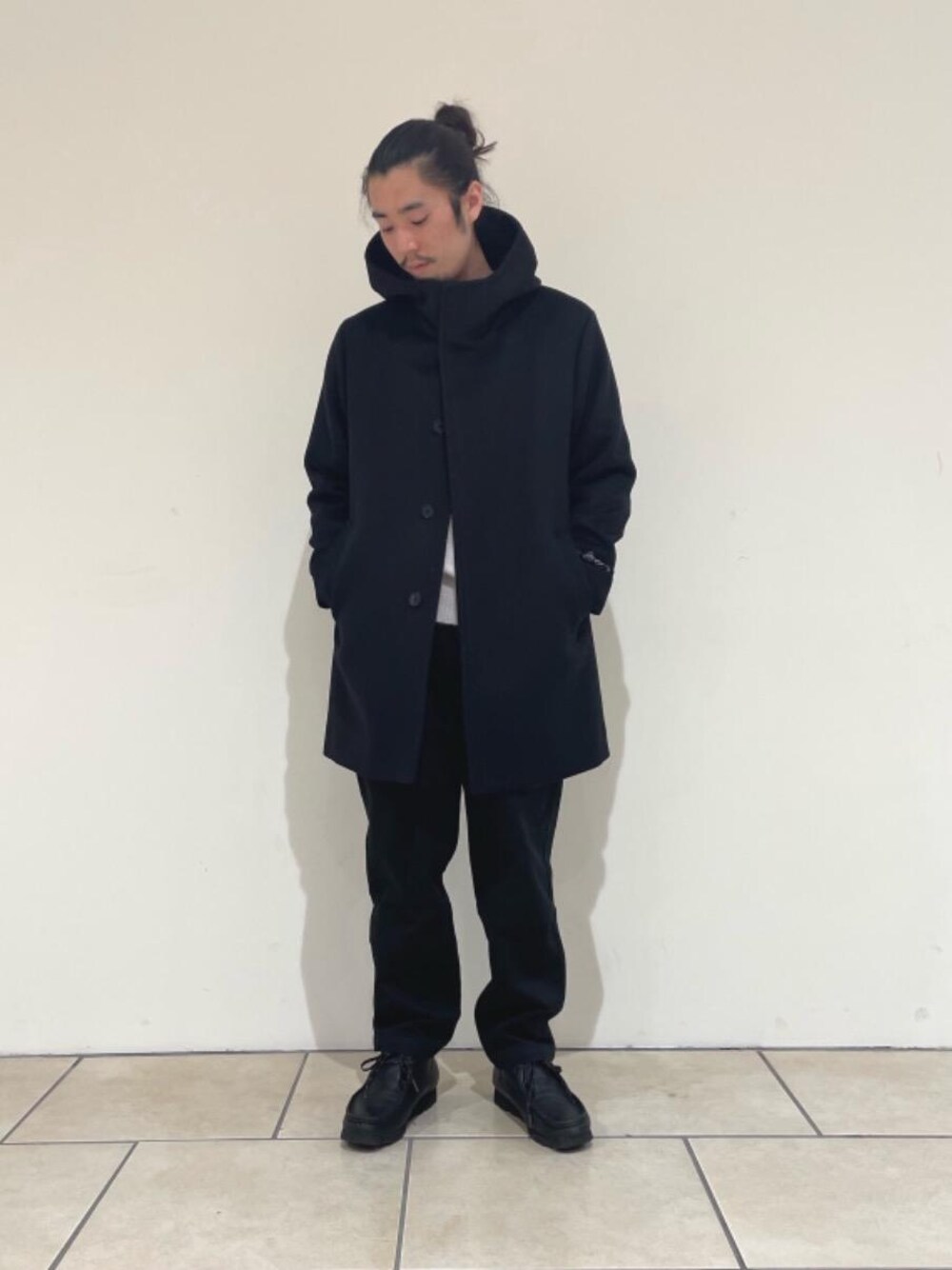 フーディーデザインのメルトンコートを使ったモノトーンなコーディネートです。全てボタンを開けて着るのももちろん良し、ネックのボタンだけ留めてシルエットを変化させて着るのもおすすめです。パンツはヘビーウェイトな生地を使用したパンツで様々なスタイルに合わせて頂けます。