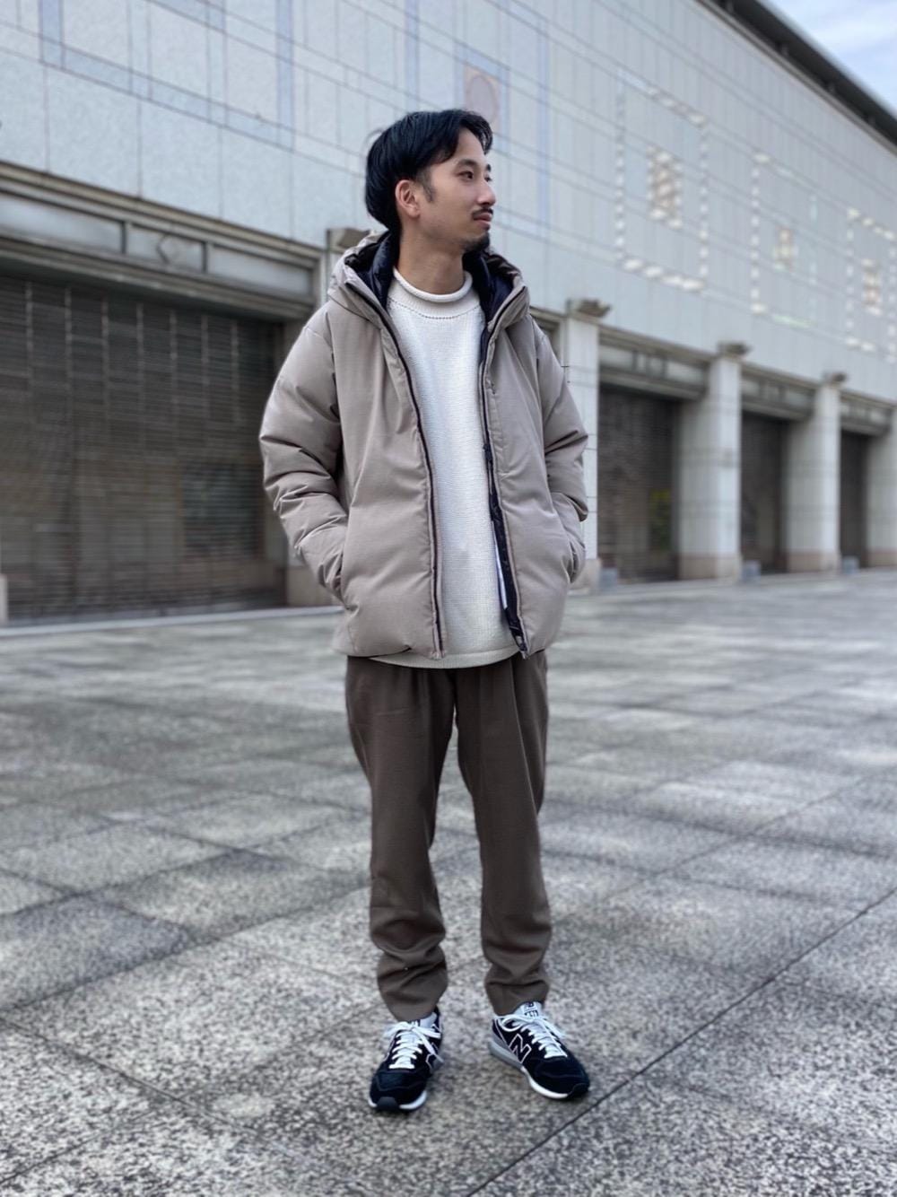 身長:171cm 普段サイズ:トップス/パンツ:Mサイズ シューズ:26cm 【サイズ感】 ダウン: ジャスト、ニット着ていてほどよくゆとりがある程度 パンツ: スッキリしたシルエット、丈は少し長く足元にややクッションができます ニット:ゆったりめ、ダウンの下に着ても動きづらさは感じない 【コーディネートポイント】 毎年定番でお作りしている小松マテーレのダウンの新色ベージュをチョイス。全体のトーンを合わせつつ、足元は黒で締まりを持たせました。