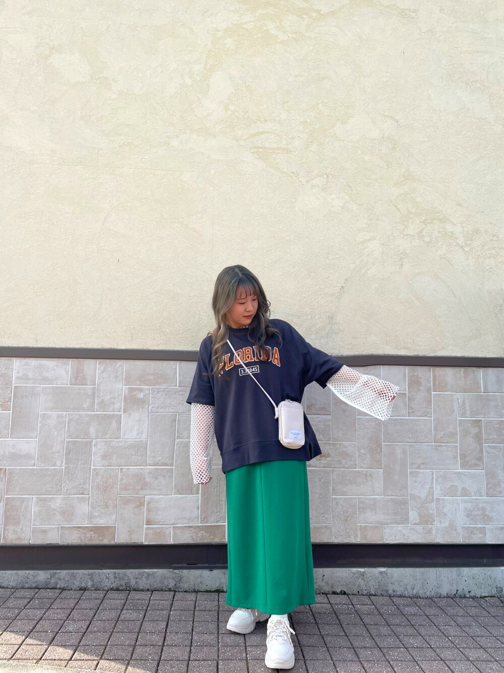 メッシュロンT+グリーンのスカート メッシュロンTをあえてインナーにすることで今年らしい着こなしに!