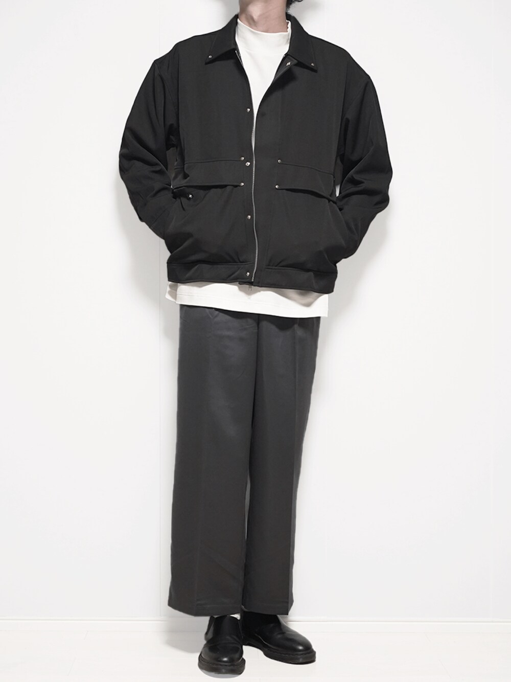 モノトーンコーデ -------------------------------------------------- こんばんは!🌙 今日はCREARE-LINO-の比翼ブルゾンを使ったコーディネートを組みました! ゆったりとしているシルエットですが綺麗めにも着れるブルゾンです!😊 今回はパンツはワイドスラックスで合わせて綺麗めよりのコーデにしました!✨ ではまた!👍