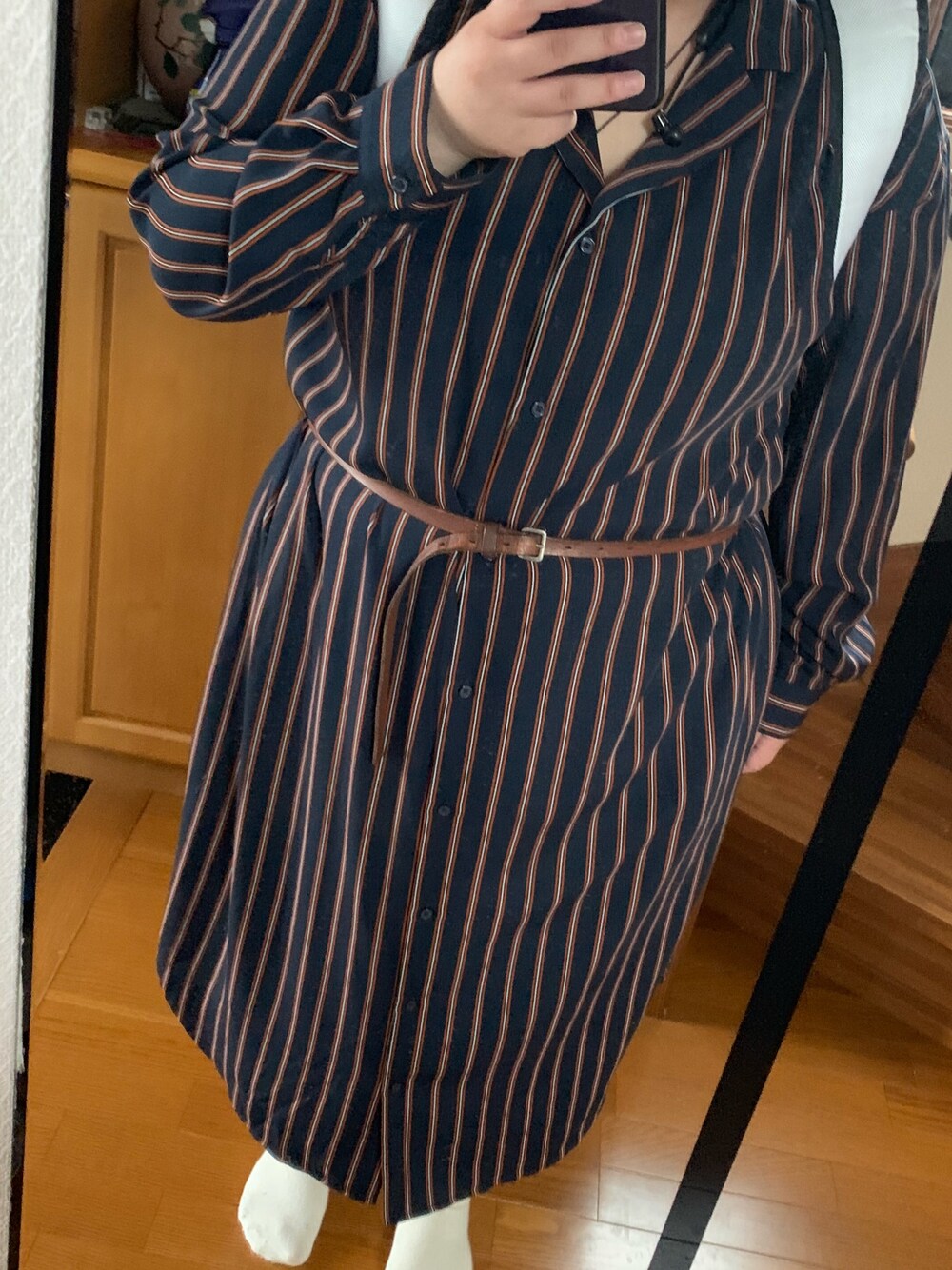 気温が中途半端、メンタルぼろぼろで仕事行きたくないんだけど、仕方ないから行くときのコーデ。 ロングカーデなのかもしれないけどボタンがあったのでワンピースにして着用、ベルトで適当に締めてボディライン作ってって感じ。